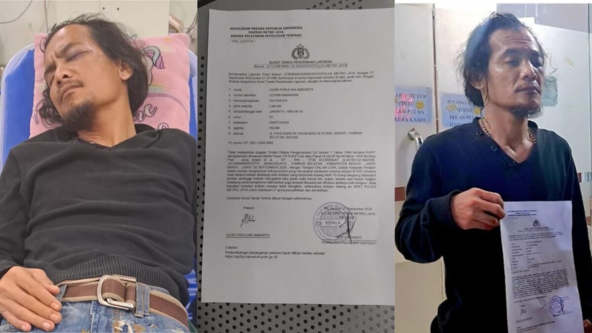 SUARAIKAWANGI, Jakarta – Kasus kekerasan terhadap jurnalis kembali mencoreng kebebasan pers di Indonesia. Seorang wartawan bernama Diori Parulian Ambarita resmi melaporkan dugaan tindak pidana pengeroyokan ke Sentra Pelayanan Kepolisian Terpadu (SPKT) Polda Metro Jaya, usai menjadi korban penganiayaan saat menjalankan tugas jurnalistik. Laporan dengan nomor: STTLP/B/6885/IX/2025/SPKT/POLDA METRO JAYA itu menyebutkan bahwa insiden terjadi pada Jumat, (26/9/2025) di wilayah Mangunjaya, Tambun Selatan, Kabupaten Bekasi.
