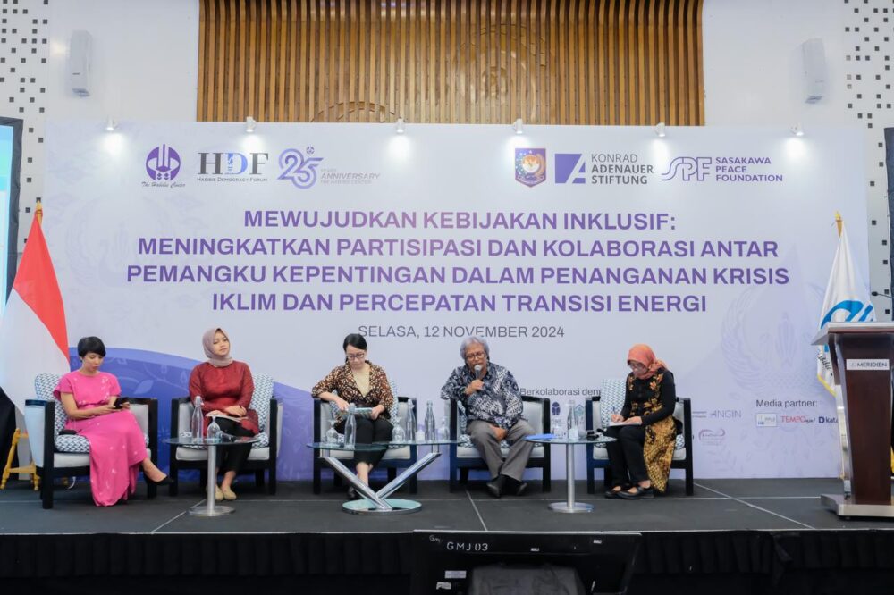 SUARAIKAWANGI, Jakarta – The Habibie Center (THC) baru selesai menyelenggarakan Habibie Democracy Forum (HDF) kedua, yaitu pada 12-13 November 2024, bertempat di Hotel Le Meridian Jakarta. Salah satu topik diskusi panel dalam HDF 2024 ini adalah “Mewujudkan Kebijakan Inklusif: Meningkatkan Partisipasi dan Kolaborasi Antar Pemangku Kepentingan dalam Penanganan Krisis Iklim dan Percepatan Transisi Energi.”