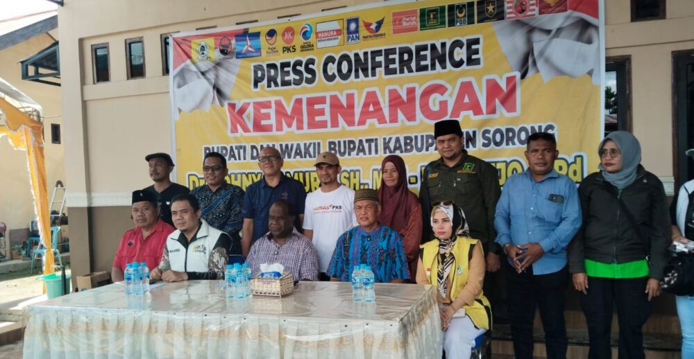 SUARAIKAWANGI, Sorong – Calon Bupati dan Calon Wakil Bupati (Cabup dan Cawabup) terpilih Kabupaten Sorong Dr Jhony Kamuru, S.H., M., Si., yang berpasangan dengan KH. Sutejo menyampaikan ucapan syukur atas perhitungan suara sementara Pemilihan Kepala Daerah 2024 untuk wilayah Kabupaten Sorong. Ucapan rasa syukur disampaikan dalam pers conference yang digelar pada, Kamis (28/11/2024) di kediaman Ketua Koalisi Pemenangan Tim JK-TEJO, Mawardi Nur.