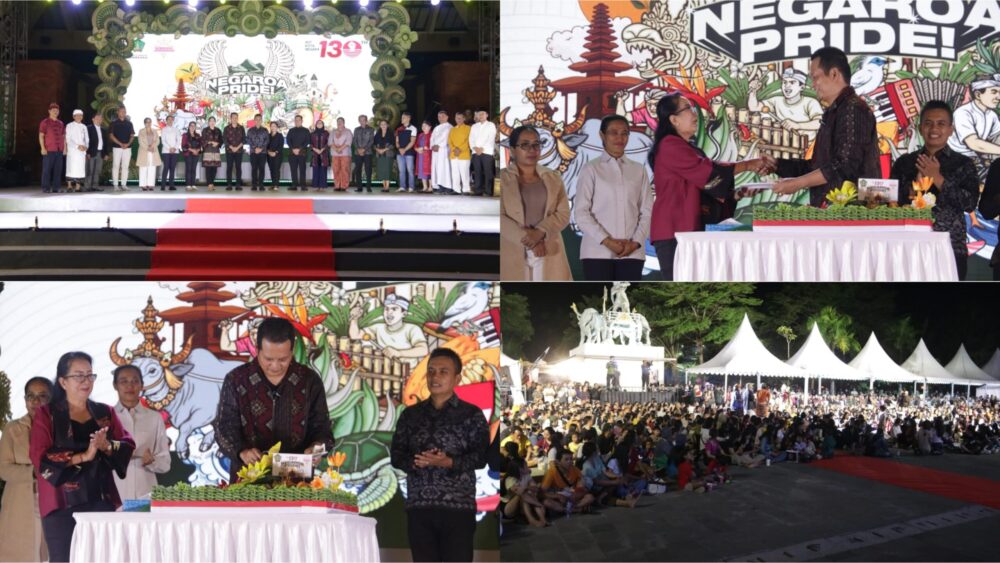 SUARAIKAWANGI, Jembrana – Bupati Jembrana I Made Kembang Hartawan didampingi Wakil Bupati (Wabup) Jembrana I Gede Ngurah Patriana Krisna menghadiri malam Puncak Festival Peringatan HUT Kota Negara ke-130. Rangkaian perayaan HUT Kota Negara telah diisi dengan berbagai kegiatan mulai dari perlombaan, hiburan, olahraga, kesenian, budaya dan tradisi, yang dikemas menjadi Festival Semarak Jembrana yang puncak peringatannya dilaksanakan, di Gedung Kesenian Ir. Soekarno, Jumat (15/8/2025).