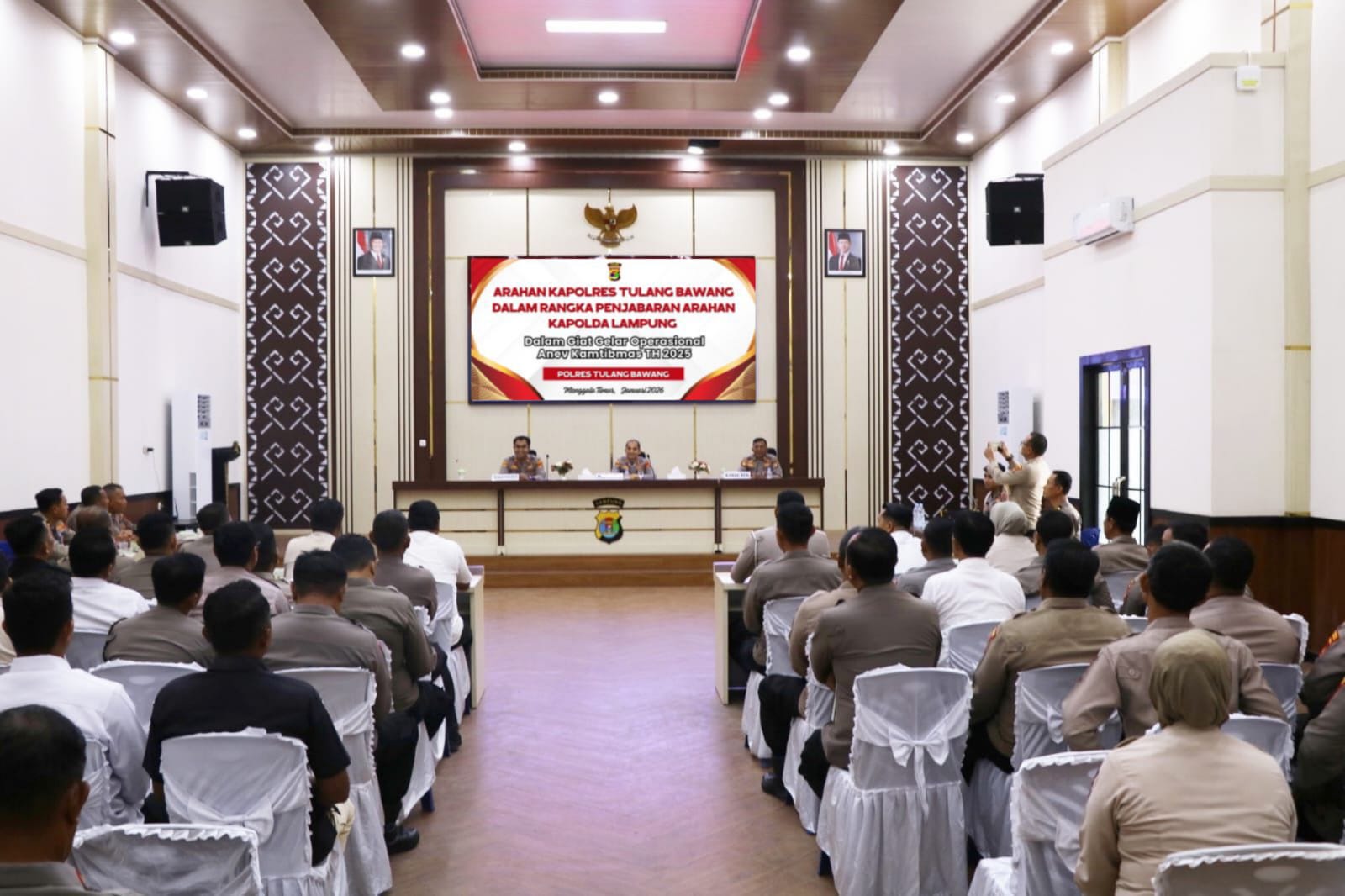 Kegiatan strategis tersebut dihadiri oleh Wakapolres Tulang Bawang KOMPOL David Jackson Sianipar, S.I.K., para Pejabat Utama (PJU), perwira, para Kapolsek jajaran, serta ASN Polres Tulang Bawang. Anev ini menjadi langkah konkret Polres Tulang Bawang dalam menindaklanjuti arahan Kapolda Lampung untuk memastikan pelaksanaan tugas Kepolisian berjalan optimal, profesional dan presisi.