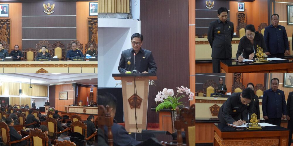 SUARAIKAWANGI, Jembrana – Penjabat sementara (Pjs) I Ketut Sukra Negara menghadiri Rapat Paripurna VI DPRD Jembrana Masa Persidangan I Tahun Sidang 2024/2025, bertempat di ruang Sidang utama DPRD Jembrana, Selasa (19/11/2024). Dalam Rapat Paripurna yang dipimpin Ketua DPRD Jembrana Ni Made Sri Sutharmi ini, anggota DPRD Jembrana dapat menyetujui Ranperda APBD Jembrana Tahun Anggaran 2025 yang kemudian dilanjutkan dengan Penandatanganan Berita Acara Persetujuan Bersama Ranperda.